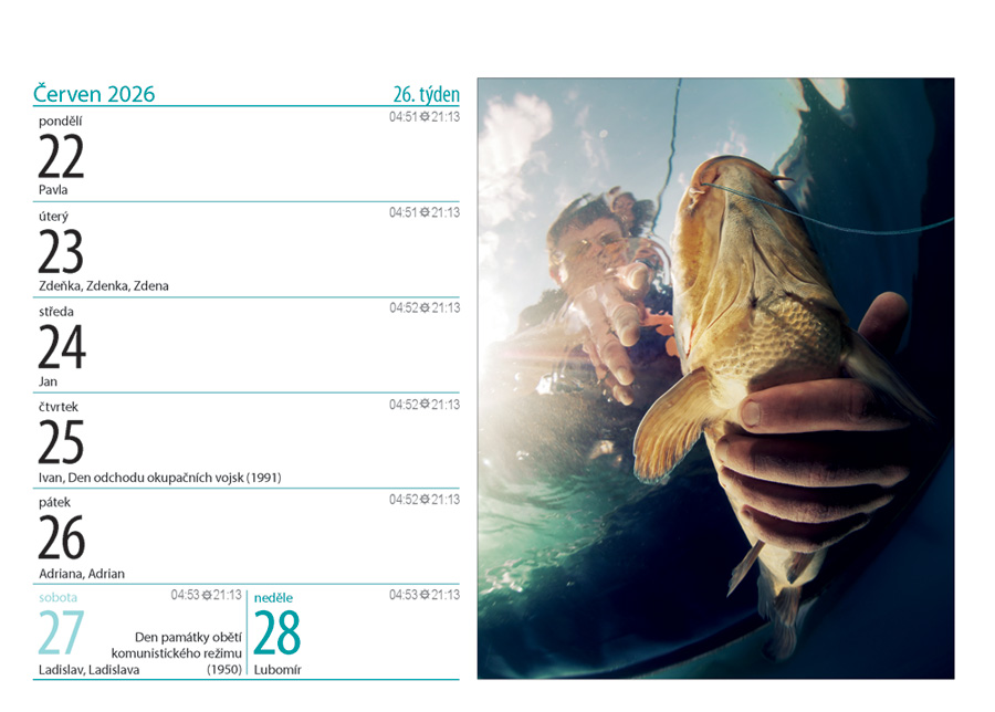 | Popis | Stolní kalendář s týdenním kalendáriem pro všechny rybáře. |