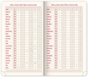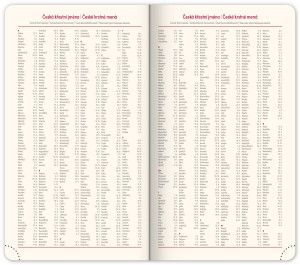 | Popis | Jemně strukturovaný povrch doplněný metalickým pruhem. Vhodný k označení logem pomocí ražby či sítotiskem. Šestijazyčné kalendárium (CZ, SK, EN, DE, HU, RU), perforované růžky, textilní záložka (u denního a týdenního modelu), gumička k uzavření diáře,poutko na propisku, zakulacené rohy, krémový papír. |