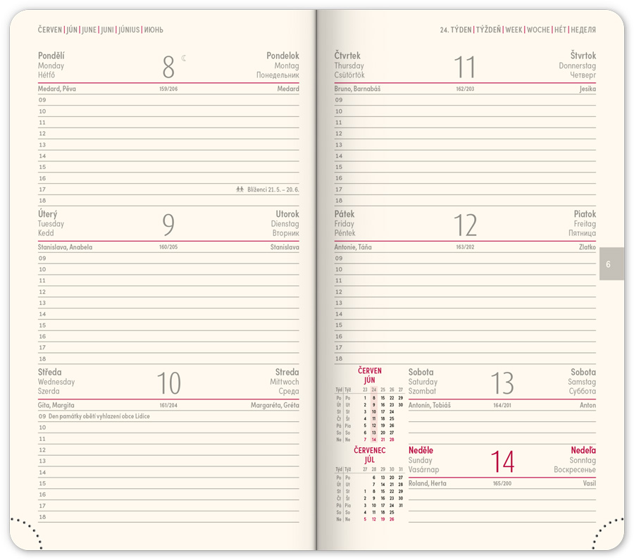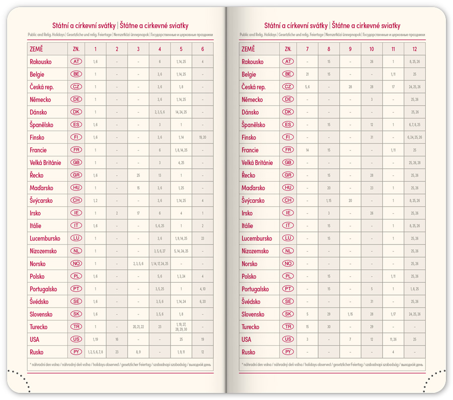 | Popis | Hladký materiál z ekologického papíru. Vhodný pro ražbu nebo potisk sítotiskem. Šestijazyčné kalendárium (CZ, SK, EN, DE, HU, RU) perforované růžky, textilní záložka (u denního a týdenního modelu), krémový papír. |