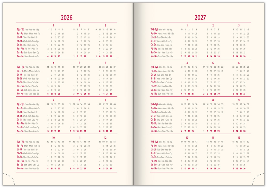 | Popis | Hladký materiál z ekologického papíru. Vhodný pro ražbu nebo potisk sítotiskem. Šestijazyčné kalendárium (CZ, SK, EN, DE, HU, RU) perforované růžky, textilní záložka (u denního a týdenního modelu), krémový papír. |