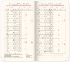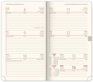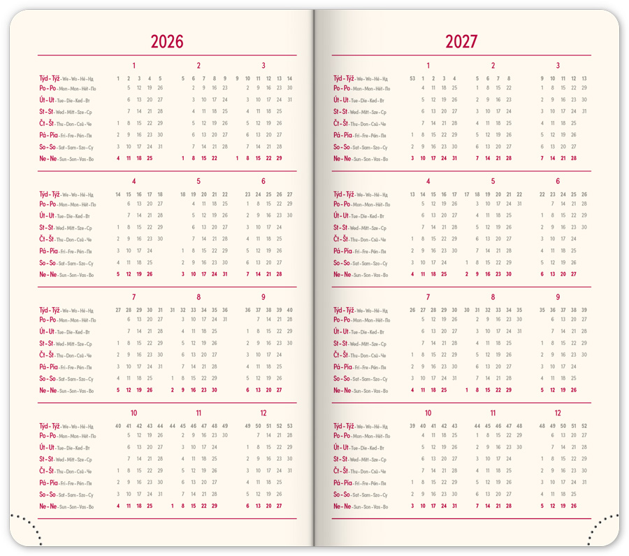 | Popis | Hladký materiál z ekologického papíru. Vhodný pro ražbu nebo potisk sítotiskem. Šestijazyčné kalendárium (CZ, SK, EN, DE, HU, RU) perforované růžky, textilní záložka (u denního a týdenního modelu), krémový papír. |