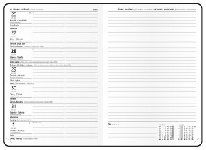 | Popis | Jemný hladký materiál vhodný k označení logem ražbou nebo sítotiskem. Čtyřjazyčné kalendárium (CZ, SK, A, N), gumička k uzavření, perforované růžky, záložka, bohaté info strany, bílý papír. |