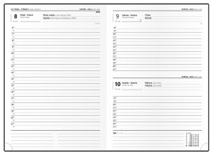 | Popis | Strukturovaný materiál vhodný k označení ražbou nebo ražbou s fólií. Čtyřjazyčné kalendárium (CZ, SK, A, N), perforované růžky, záložka, bohaté info strany, poutko na propisku, kvalitní bílý papír. |