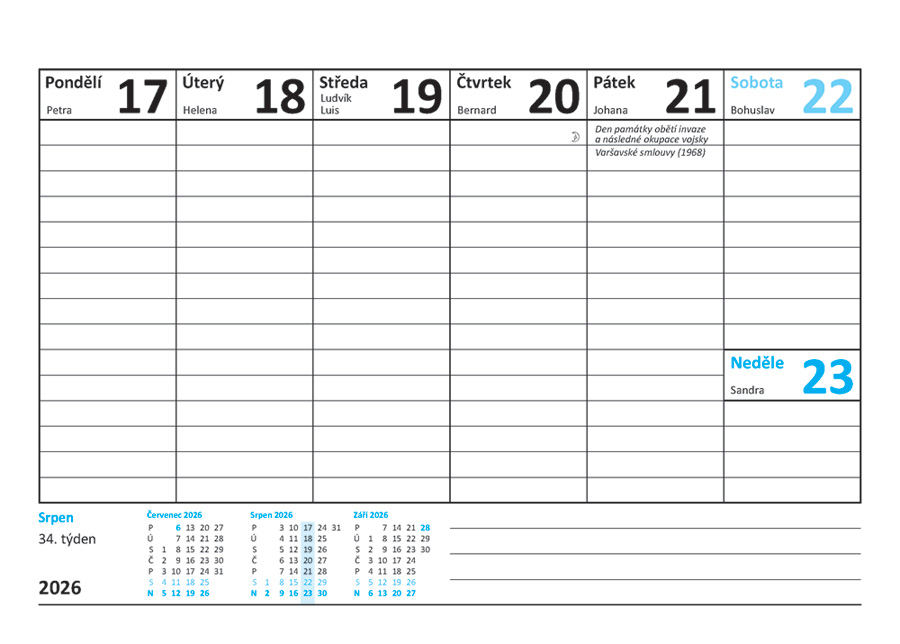 | Popis | Jednoduchý a praktický pracovní kalendář s týdenním kalendáriem v modro-bílé barevné kombinaci. |