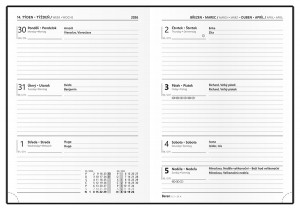 | Popis | Materiál s nepoškrabatelným matným laminem s parciálním lakem. Čtyřjazyčné kalendárium (CZ, SK, A, N), perforované růžky, bohaté info strany, kvalitní bílý papír. |