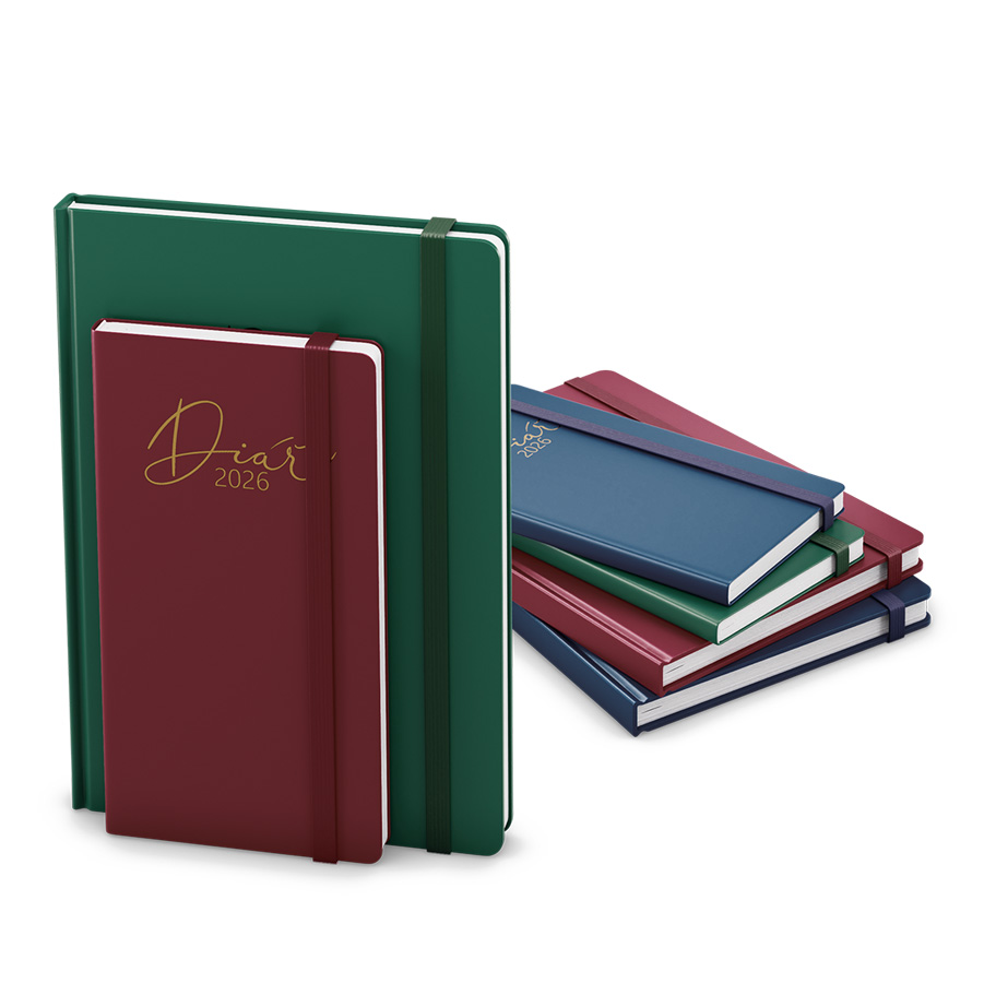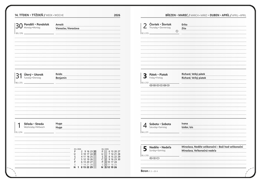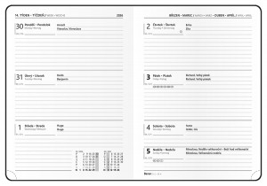 | Popis | Sametově hladký materiál vhodný k označení logem sítotiskem nebo ražbou s fólií. Čtyřjazyčné kalendárium (CZ, SK, A, N), perforované růžky, záložka, bohaté info strany, krémový papír. |