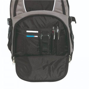 | Popis | Bohatě vybavený batoh má 2 přední kapsy na zip - jednu s malým organizérem, hlavní prostor rozdělený na 2 velké kapsy na zip s polstrovanou kapsou na notebook, jednu kapsu s otvorem na kabel pro sluchátka, 1 kapsu na zip na klíče, 2 boční síťované kapsy a poutko, zesílené madlo batohu, polstrované ramenní popruhy a vypolstrovaná záda. Materiál 600D polyester. |
