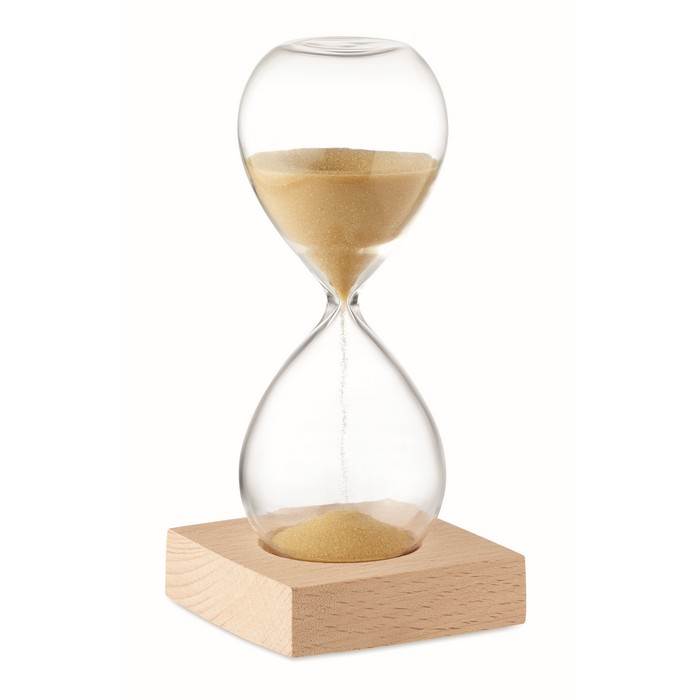 | Popis | Pětiminutové přesýpací hodiny z borosilikátového skla s podstavcem z bukového dřeva. Podstavec lze obrandovat tampoprintem či laserem, tampoprintem lze potisknout i skleněnou část |