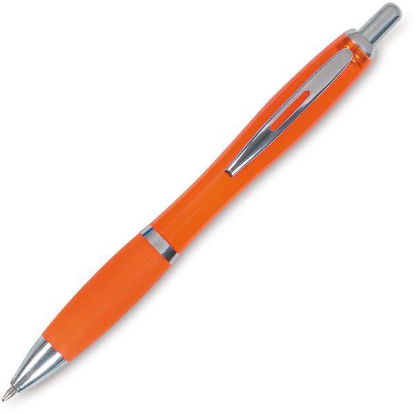 | Popis | Oranžové plastové transparentní pero s projmutým tělem a se stříbrnými kovovými doplňky má modře píšící náplň. |