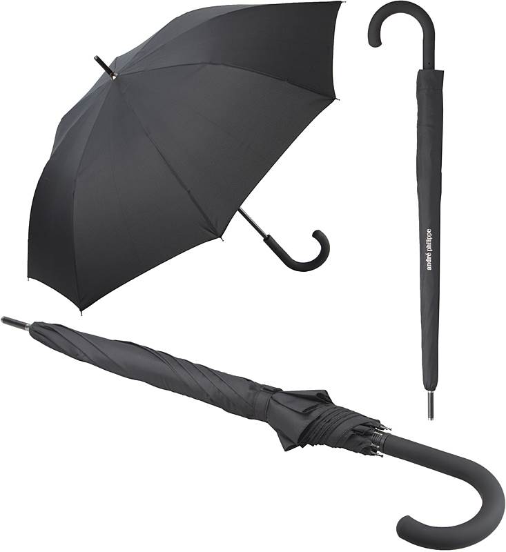| Popis | Osmipanelový deštník s automatickým otevíráním má pogumovanou zahnutou rukojeť, sklolaminátovou konstrukci a kovová žebra. Deštník je vyroben ze 190T hedvábného polyesteru, je větruodolný, má průměr 103 cm a je uložen v obalu s logem André Philippe. |