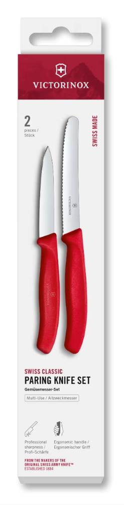 | Popis | Sada dvou nožů VICTORINOX v papírové krabičce. Obsahuje nože 90380.R a 90382.R (nůž na zeleninu s hladkým ostřím 8cm a nůž na rajčata s vlnkovým ostřím 11cm). TATO SADA JE POUZE NA OBJEDNÁVKU. Ohledně možného termínu dodání prosím kontaktujte před objednávkou naše obchodníky. Krabička je zalepená, nelze otevřít bez viditelného odlepení, z toho důvodu je možný potisk pouze na krabičku. Na menším noži je logo Victorinox natištěno na ochranné fólii čepele. Při tisku/ laseru je nutno tuto fólli opatrně odstranit a následně zpět nalepit |