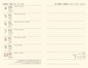 | Popis | Lehké desky z přírodního korku jsou vhodné k označení sítotiskem bez drobných detailů nebo ražbou s fólií. Pětijazyčné kalendárium (CZ, SK, A, N,R), bohaté info strany, gumička k uzavření diáře, béžový papír. |