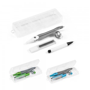 | Popis | Geometrický školní set v pouzdře z PP. Zahrnuje 1 kružítko, 1 pentilku a 10 tuh do pentilky o průměru 0.5 mm. 128 x 42 x 20 mm |