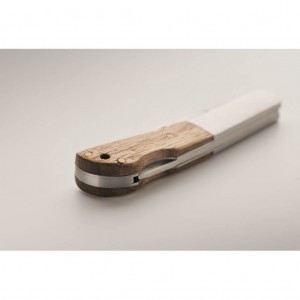 | Popis | Zavírací nůž z nerezové oceli s rukojetí z akáciového dřeva. Délka čepele 6 cm. Potisková plocha 35x10 mm (kovová část rukojeti), 20x8 mm (dřevěná část rukojeti). |