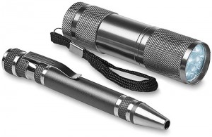 | Popis | Sada nářadí s 9 LED hliníkovou svítilnou a hliníkovým multifunkčním nástrojem ve tvaru pera. Obsahuje 3 ploché a 3 křížové šroubováky. 3 baterie AAA nejsou součástí. Hliníková svítilna s 9 LED diodami se dodává s tkaným nylonovým páskem na zápěstí. Baleno ve stříbrné plechové krabičce. V ceně zboží je zahrnut recyklační příspěvek na likvidaci elektroodpadů ve výši 2 Kč. |