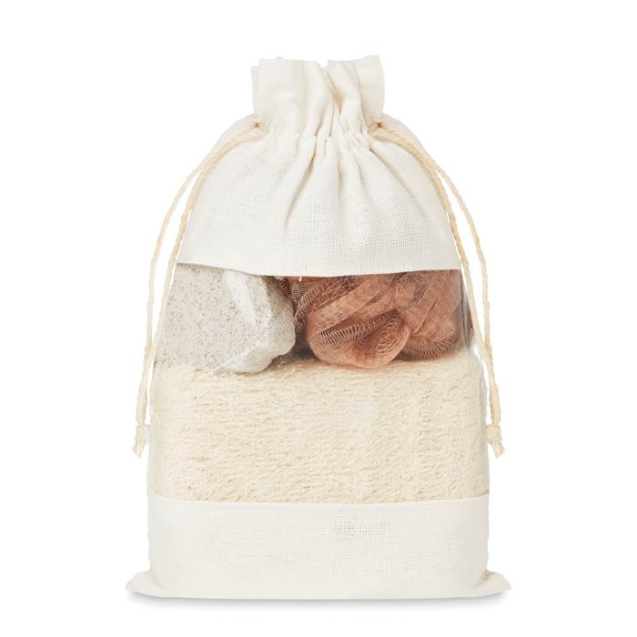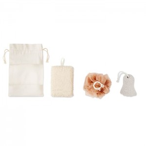 | Popis | Koupelnová souprava včetně houby, pemzy a žínky v jutové tašce s okénkem z PEVA. |
